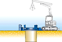 レボ立坑機により、矢板支保工、ライナープレート等を使用しないで、円形ケーシングチューブを使用した立坑を構築する方法です。レボ工法では、本体及びカウンターウエイトから反力を取り、油圧ジャッキによって分割型ケーシングチューブを揺動圧入し、クラムシェル等で掘削します。